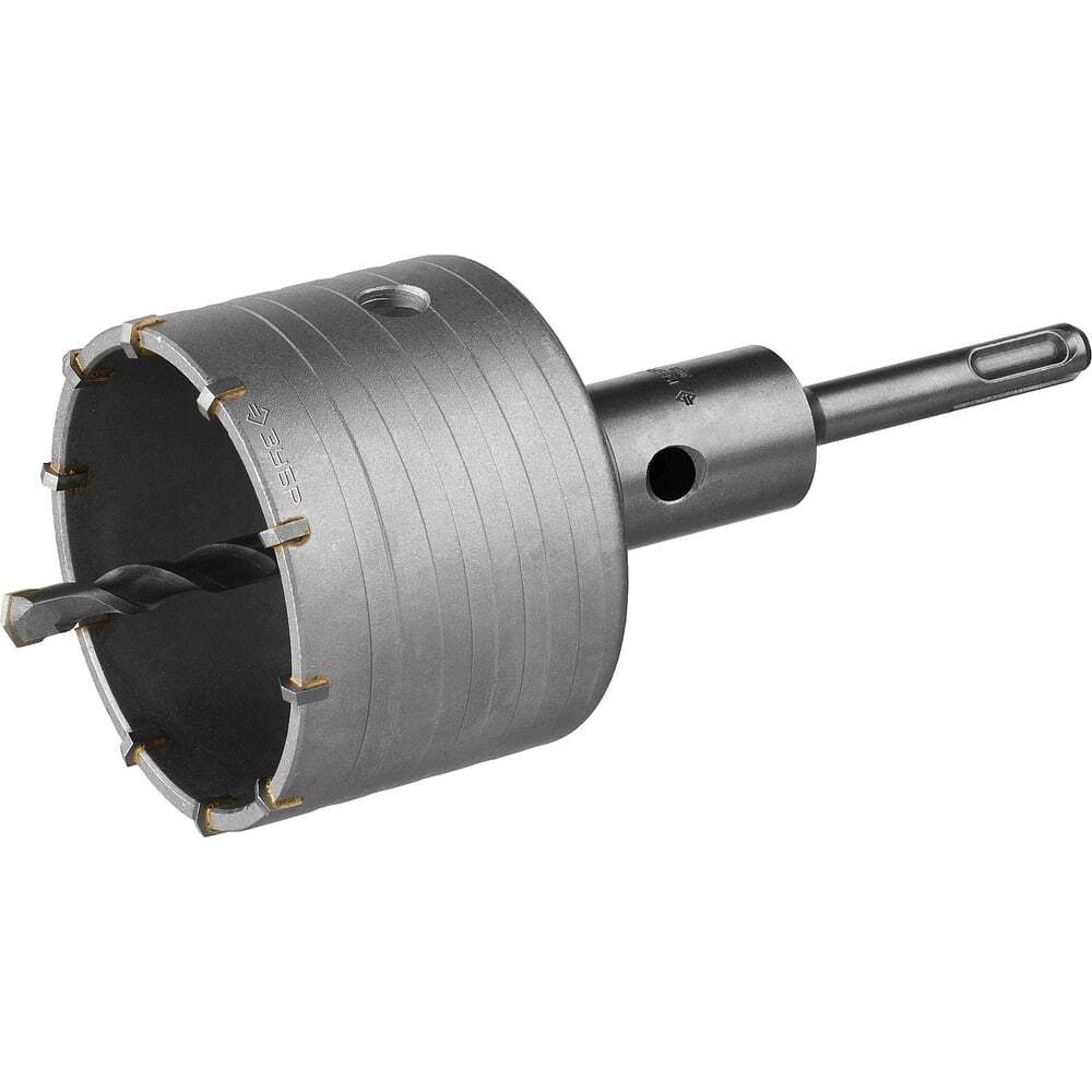 Коронка по бетону с оснасткой Профессионал (80 мм; SDS-Plus) ЗУБР 2918-80_z01 используется в перфораторах и дрелях с типом патрона SDS-Plus в режиме ударного сверления, мощность инструмента должна быть не менее 850 Вт. Изготовлена оснастка из высококачественной углеродистой стали и оснащена твердосплавными резцами. Центрирующее сверло с твердосплавным наконечником имеет конусный хвостовик, такое соединение обеспечивает надежную фиксацию центрирующего сверла. Подходит данная коронка для работ по бетону, граниту, природному и искусственному камню, кирпичной кладке. Дополнительные параметры: Центрирующее сверло - 8х110 мм; Державка - 120 мм, резьба М22.