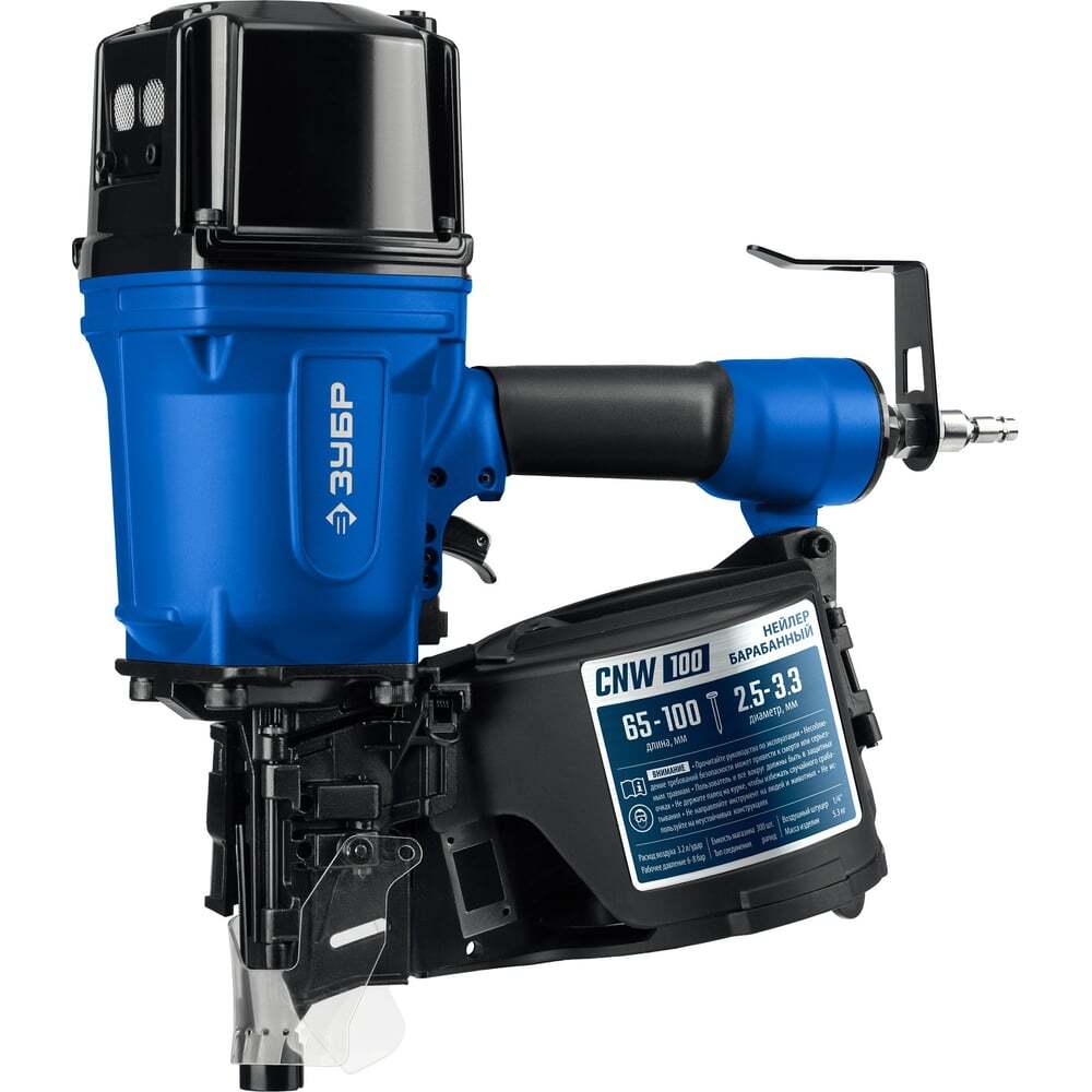 Пневматический нейлер для барабанных гвоздей ЗУБР Профессионал CNW-100 31915 предназначен для производства паллет (поддонов) и других изделий из дерева, таких как тара, ящики и упаковка. Расходный материал - гвозди длиной 65-100 мм барабанного типа.