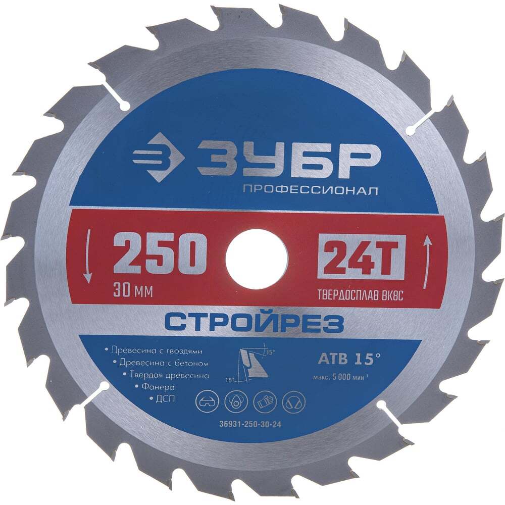 Диск пильный по строительной древесине ЗУБР Стройрез Профессионал 250х30 мм, 24Т 36931-250-30-24 предназначен для реза строительной древесины с гвоздями, остатками цемента, твердой древесины, фанеры, ДСП. Тип заточки зубьев: АТВ. Материал корпуса диска: сталь 65Mn. Материал твердого сплава: твердый сплав ВК8. Припой зуба: автоматический.