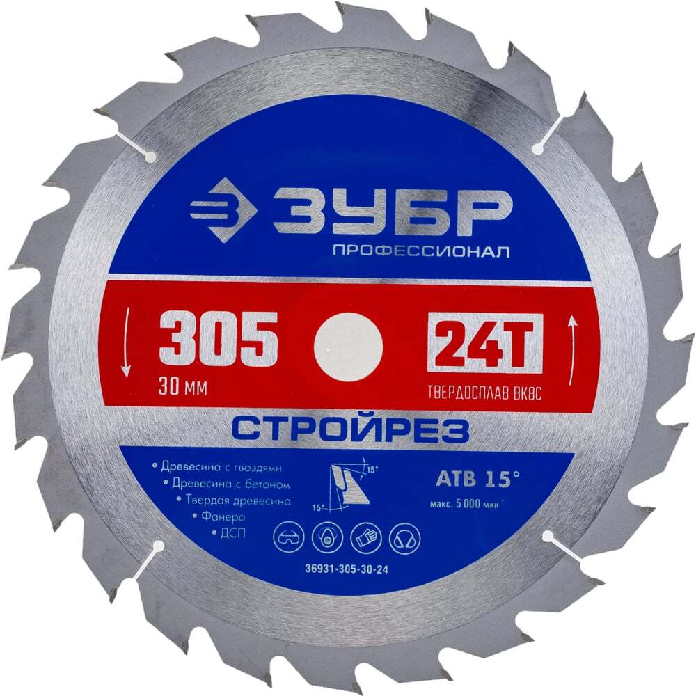 Диск пильный по строительной древесине ЗУБР Стройрез Профессионал 305х30 мм, 24Т 36931-305-30-24 предназначен для реза строительной древесины с гвоздями, остатками цемента, твердой древесины, фанеры, ДСП. Тип заточки зубьев: АТВ. Материал корпуса диска: сталь 65Mn. Материал твердого сплава: твердый сплав ВК8. Припой зуба: автоматический.
