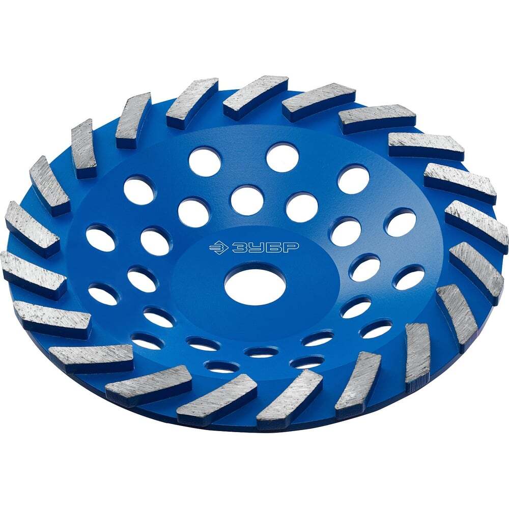Сегментная алмазная чашка ЗУБР Профессионал Турбо 180 мм 33370-180_z01 предназначена для сухого шлифования искусственных и природных строительных материалов: бетона, кирпича, камня, плитки. Используется на УШМ. Служит для быстрого шлифования. Основным рабочим элементом является синтетический алмаз повышенной твердости. Корпус алмазной чашки изготовлен из высокопрочной стали. Изделие проходит строгий контроль качества, особое внимание уделяется сбалансированности, т.к. инструмент работает на больших оборотах. Высота сегмента: 5 мм. Основание: фрезерованное. Максимальная частота вращения: 7900 об/мин.